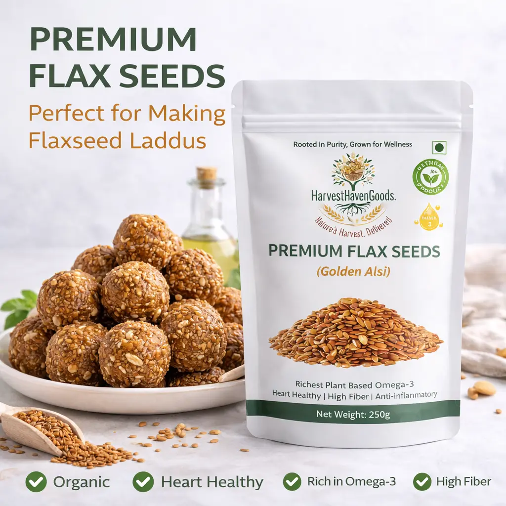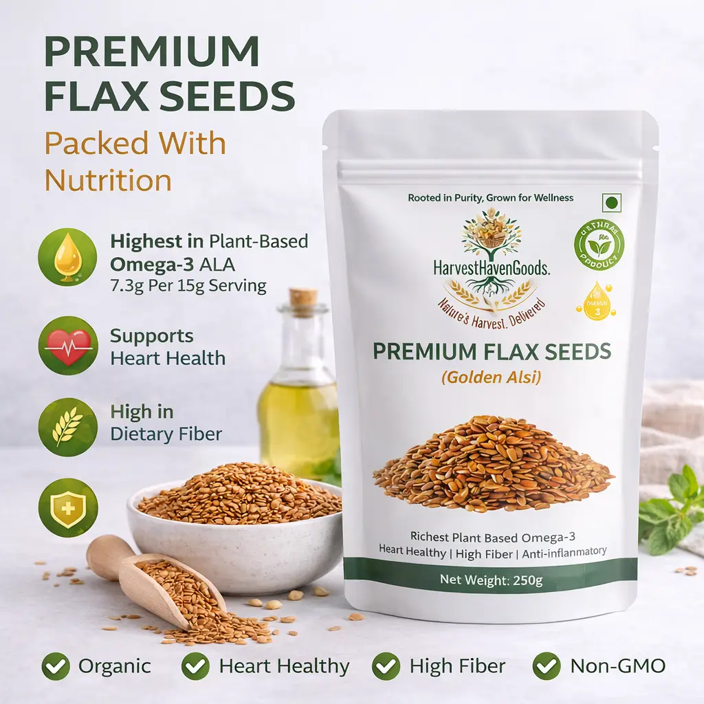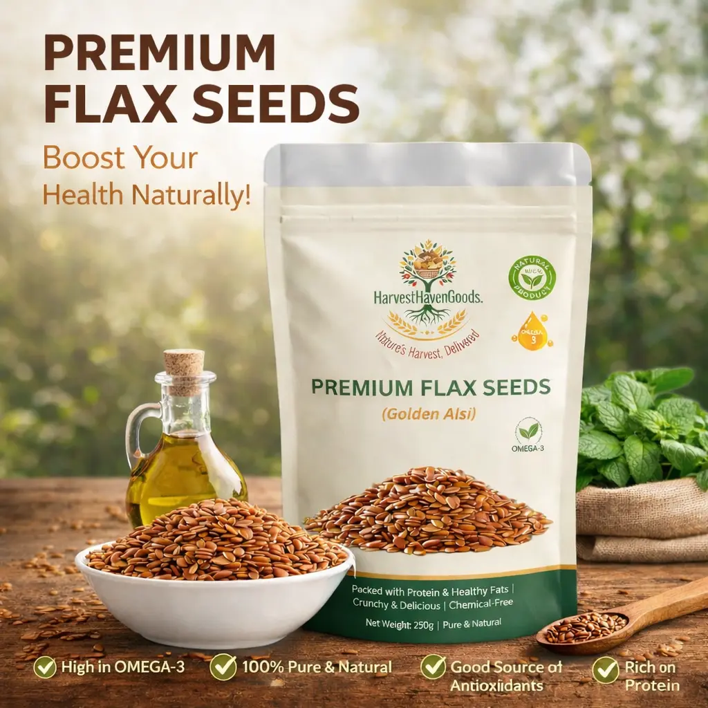 Premium Flax Seeds: Discover the finest Premium Organic Flax Seeds (Golden Alsi) from HarvestHavenGoods – your trusted source for naturally grown, chemical-free organic superfoods. Sourced directly from certified organic farms, our golden flax seeds are carefully selected, processed, and lab-tested to ensure you receive only the highest quality nutrition for your family.